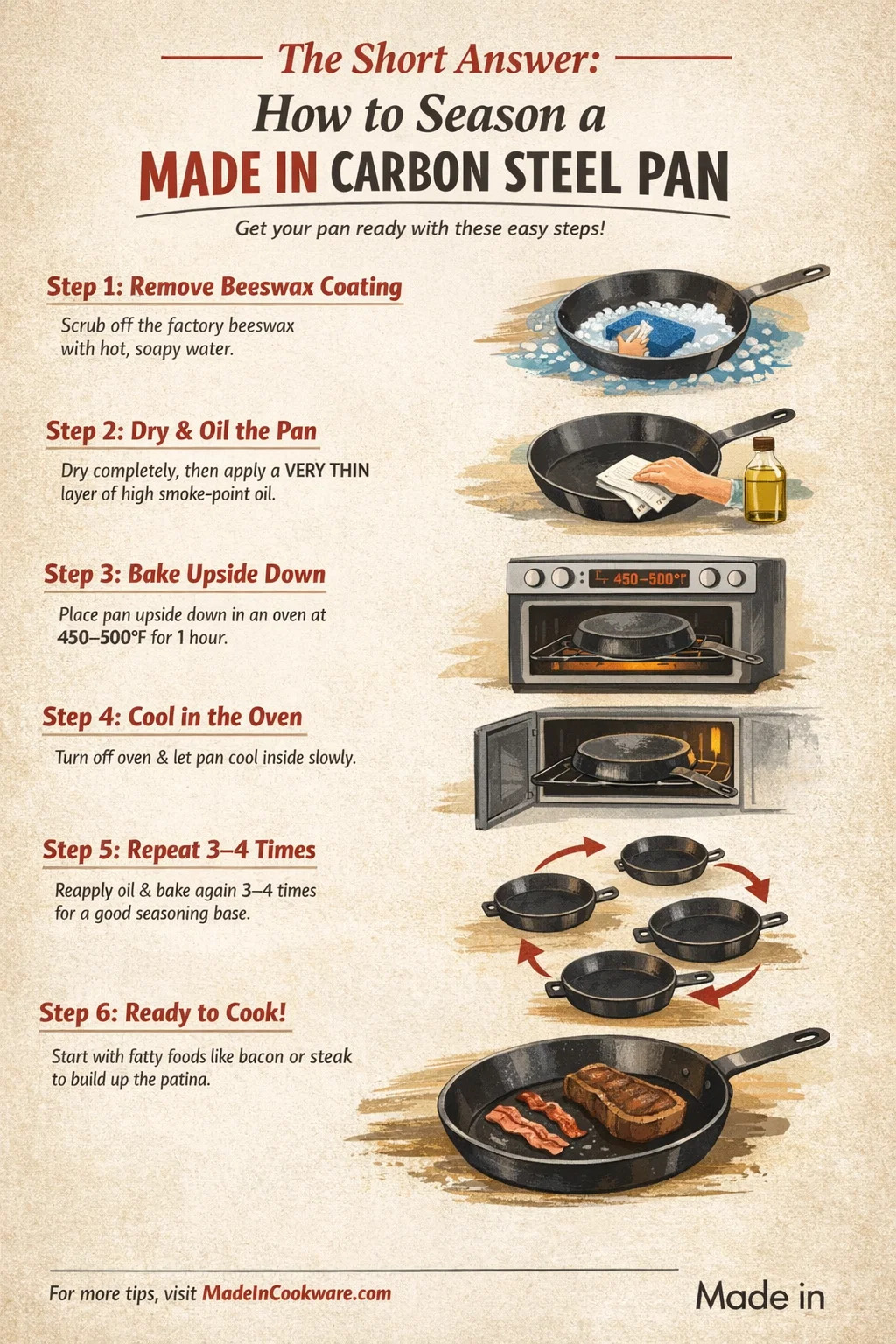 Metóda v rúre sa odporúča na počiatočné dochucovanie panvíc Made In z uhlíkovej ocele, pretože ohrieva celý povrch – vrátane strán a exteriéru – rovnomerne a konzistentne. Tu je celý proces podrobne: