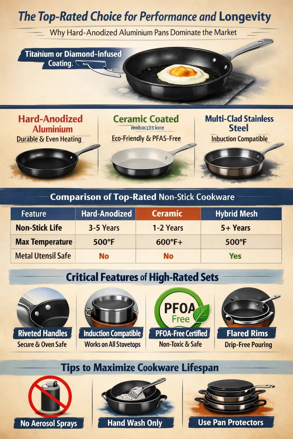Najvyššie hodnotené nepriľnavý riad v súčasnosti na trhu dominuje Panvica z tvrdého eloxovaného hliníka , konkrétne modely s viacvrstvovými zosilnenými nátermi. Profesionálni kuchári a domáci kuchári neustále hodnotia tieto súpravy na najvyššej úrovni, pretože premosťujú priepasť medzi uvoľnením jedla bez námahy a robustnou trvanlivosťou. Značky, ktoré využívajú povrchy vystužené titánom alebo diamantom získať najvyššie známky za odolnosť proti poškriabaniu a zachovanie hladkosti počas viac ako 5 rokov každodenného používania.